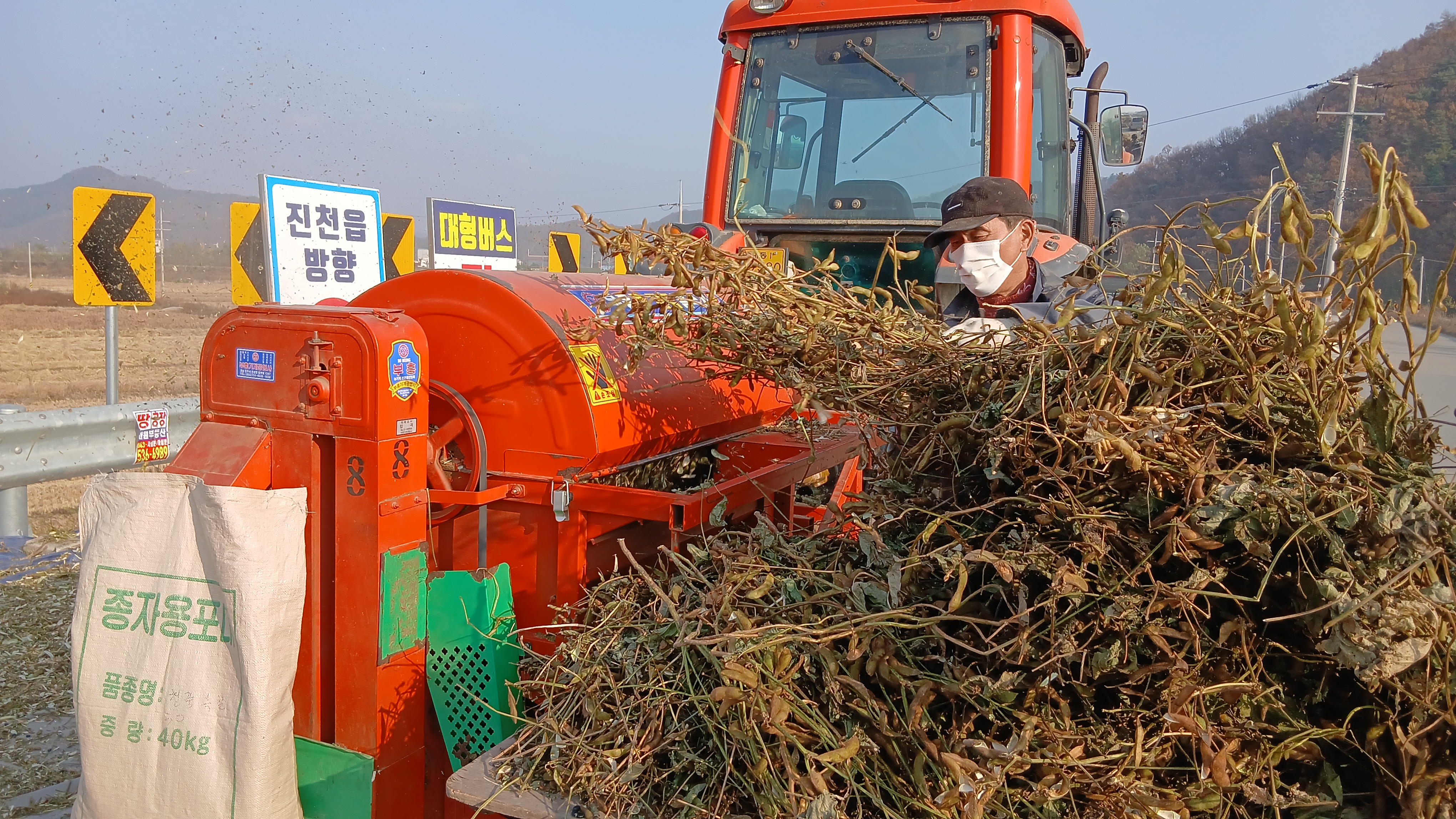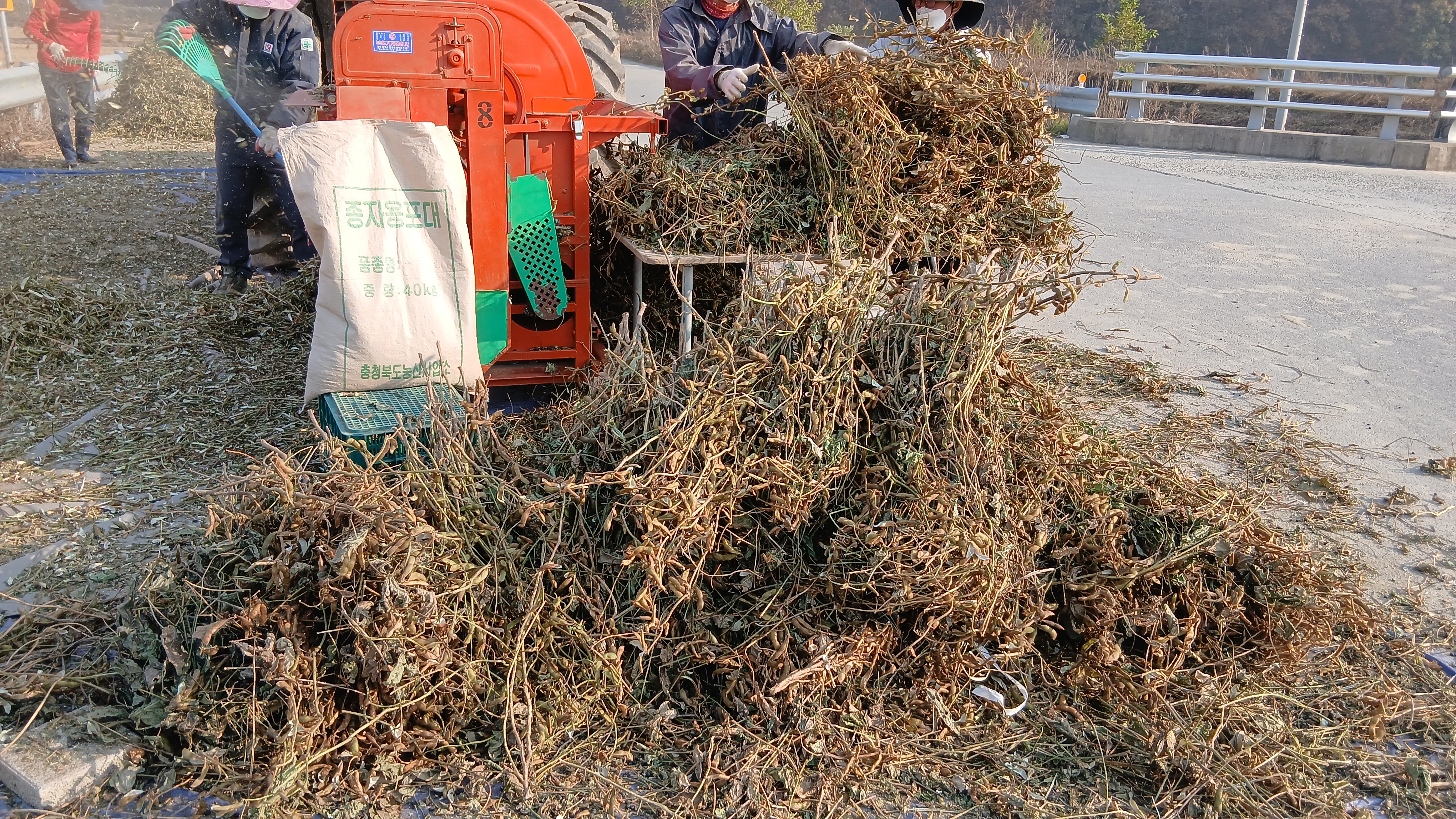 - 농가에서는 **탈곡기(콩 탈곡기)**를 사용합니다.